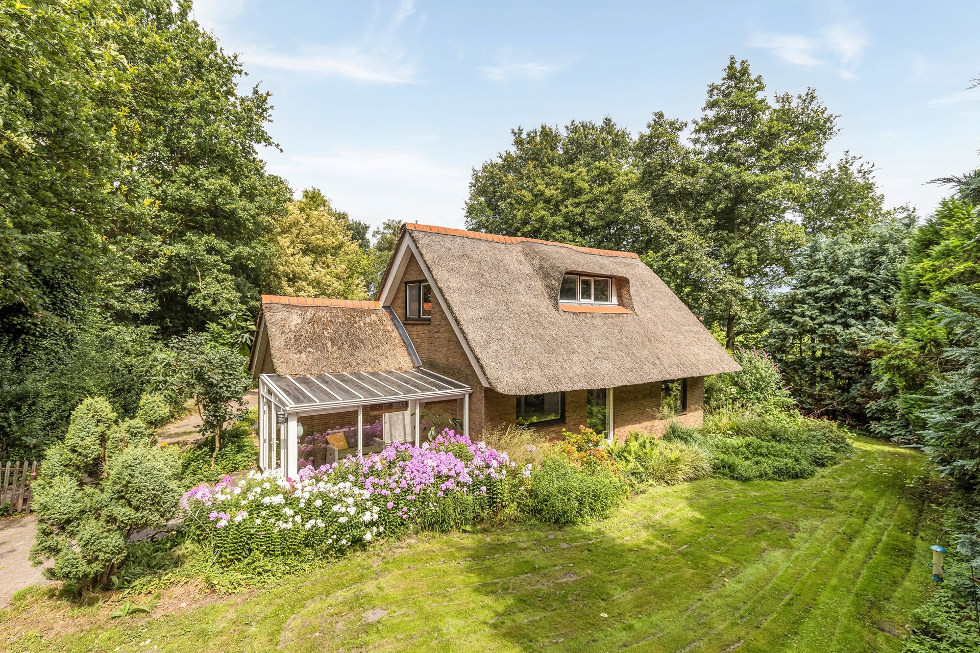 De woning beschikt aan de voorzijde over een aangebouwde tuinkamer en heeft aan de achterzijde een royale serre. Hier kunt u het jaar rond heerlijk vertoeven en genieten van het schitterende uitzicht over de stijlvol aangelegde tuin. De ruime hal/bijkeuken geeft toegang tot een moderne toiletruimte en een gezellige woonkeuken. Vanuit de woonkeuken loopt u door naar een U-vormige woonkamer, die uitzicht op de tuin rondom biedt en waarin een houtkachel aanwezig is. Via de open trap komt u op de 1e verdieping die ruimte biedt aan twee prettige lichte slaapkamers en een moderne luxe badkamer.