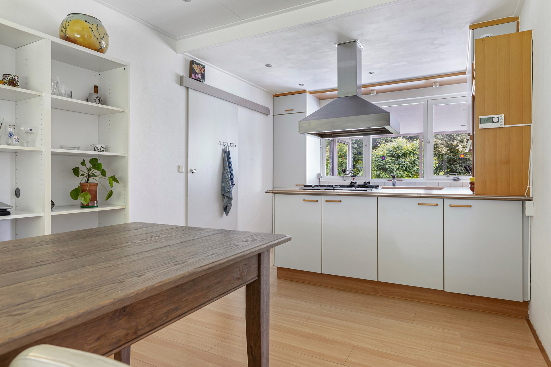 - woon-/slaapkamer v.v. keukenblok met koelkast (niet gebruikt) en tuindeur